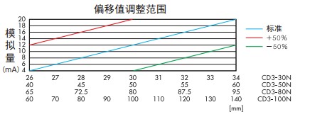 激光位移傳感器CD3系列產(chǎn)品特點(diǎn): ● 采用高精度CMOS感光元器件。 ● 模擬量輸出設(shè)有跨度(SPAN)和歸零設(shè)定功能,以滿足各種 應(yīng)用的需求。 ● 可預(yù)設(shè)模擬量的上下限值作為報(bào)警輸出。 ● 內(nèi)置數(shù)字顯示器。 ● 按鍵示教,數(shù)顯面板,操作簡便。簡易的示教按鍵,便于監(jiān)視的數(shù)字顯示器。 ● 無論是反射率高的光澤面,還是如黑色橡膠等低反射率的物體,CD3系列均能穩(wěn)定測(cè)量。 ● 電壓輸出轉(zhuǎn)換器CV-15 若需要將4-20mA模擬電流輸出轉(zhuǎn)換成1-5V模擬電壓輸出,則可連接電阻CV-15 。 ● 偏移值 設(shè)定偏移值是一個(gè)補(bǔ)償功能,可對(duì)正負(fù)極模擬輸出值進(jìn)行反轉(zhuǎn)。 設(shè)定范圍為傳感器檢測(cè)距離的±50% 。 ● 跨度調(diào)整 調(diào)整跨度值改變測(cè)量值(位移量)與距離之間的比例關(guān)系。 設(shè)定范圍為傳感器檢測(cè)距離的±50% 。 ● 超出量程時(shí)的模擬量輸出保持功能 當(dāng)模擬量值超出量程時(shí),有如下兩種保持功能可選: CLP 模式:模擬量值保持輸出24mA ; HOLD 模式:模擬量輸出值為正常測(cè)量時(shí)的后一個(gè)測(cè)量值。 激光位移傳感器CD3系列技術(shù)參數(shù):