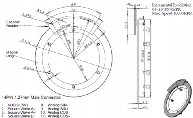 產(chǎn)品介紹嵌入式空心編碼器EI105H70 產(chǎn)品介紹: EI105H70是一款空心的內(nèi)嵌式增量磁性旋轉(zhuǎn)編碼器,無外殼結(jié)構(gòu),PCB外徑105mm,內(nèi)徑70mm,易于設(shè)備的內(nèi)部安裝,與客戶設(shè)備形成一個(gè)整體,板載的讀透可以感應(yīng)到磁場強(qiáng)度,因而可以測量出旋轉(zhuǎn)角度及轉(zhuǎn)速,分辨率為2^12~20位PPR可選。 技術(shù)參數(shù):