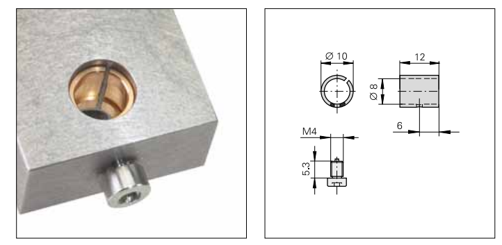 MS 200支架 用于安裝帶直徑8 mm裝夾桿的 長度計,例如AT、ST、 MT 1200、MT 2500 ID 324391-02 裝夾套 長度計 AT,ST MT 1200 MT 2500 用于可靠固定長度計而不使8h6裝 夾桿的夾緊力過大。 包括: 襯套、夾緊螺絲 ID 386811-01(1件) ID 386811-02(10件)