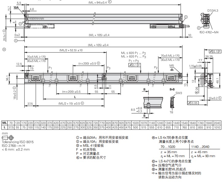 測(cè)量長(zhǎng)度ML* 單位mm | 對(duì)ML 1240以內(nèi)光柵尺, 安裝板*為可選,對(duì)ML 1340以上光柵尺為必選 70 120 170 220 270 320 370 420 470 520 570 620 670 720 770 820 920 1020 1140 1240 1340 1440 1540 1640 1740 1840 2040 |