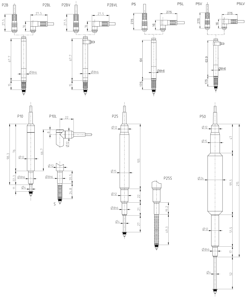 產(chǎn)品介紹筆式傳感器/高精度電感測頭.電子測頭:SYLVAC,P2,P5,P10,P25,P50 高精度電感測頭:SYLVAC,P2,P5,* 圖片為傳感器的應(yīng)用圖 *B=滾軸軸承;V=真空提升;L=直角型;S=測頭處帶有橡膠保護(hù)套。如未特殊注明為摩擦式軸承P10,P25,P50電感測頭,電感傳感器
