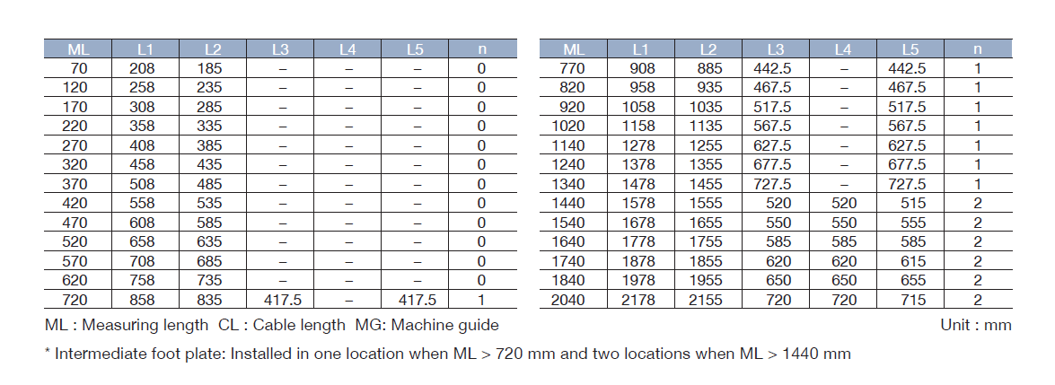 | Measuring length (ML) | 70~2040mm 70, 120, 170, 220, 270, 320, 370, 420, 470, 520, 570, 620, 720, 770, 820, 920, 1020, 1140, 1240, 1340, 1440, 1540, 1640, 1740, 1840, 2040 | 70~2040mm 70, 120, 170, 220, 270, 320, 370, 420, 470, 520, 570, 620, 720, 770, 820, 920, 1020, 1140, 1240, 1340, 1440, 1540, 1640, 1740, 1840, 2040 |